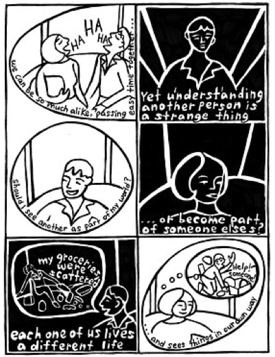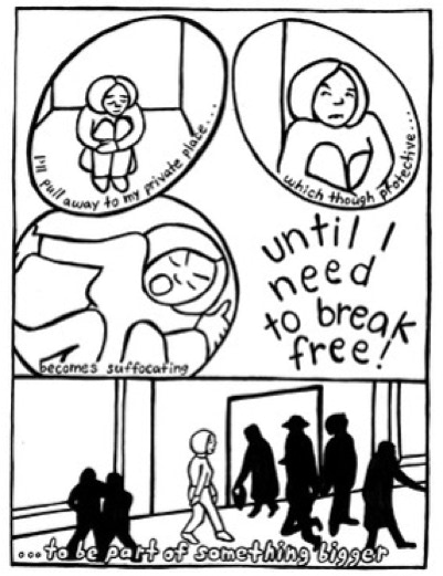 I was influenced by Raw, Weirdo, Drawn and Quarterly, Julie Doucet, Love and Rockets, Robert Crumb, Seth, Chester Brown, Joe Matt, Lynda Barry, Fiona Smyth, among others. I made a comic with a friend and we printed it by photocopier. Then I started university in Visual Art. I found my profs were not sympathetic to comics, but I did contribute to a compilation at Concordia University in Montreal organized by another student.